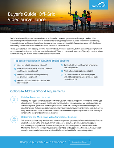 Deploying video surveillance for construction site security and other off-grid security applications can be challenging. Fortunately Camcloud’s serverless video surveillance works over any network, including 4G/5G and satellite, in addition to seamless compatibility with a variety of solar cameras.